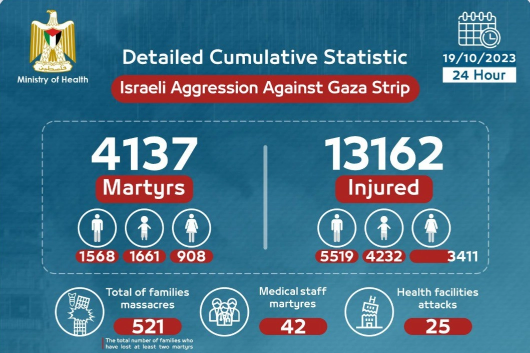 Filistin Sağlık Bakanlığı’ndan bugün yapılan açıklamada, İsrail’in saldırıları sonucu 4 bin 137 sivilin yaşamını yitirdiği, 13 bin 162 sivilin de yaralandığı belirtildi. Bakanlık hayatını kaybedenler arasında 1661 çocuk ve 908 kadın olduğunu; yaralananlar arasında ise 4 bin 232 çocuk, 3 bin 411 de kadının bulunduğunu aktardı. ‘1400 KİŞİ ENKAZ ALTINDA’ Bakanlık açıklamasında 720'si çocuk olmak üzere 1400 kişinin enkaz altında olduğuna dair ihbar aldıklarını ifade ederek 42 sağlık görevlisinin de saldırılarda öldüğünü ifade etti.