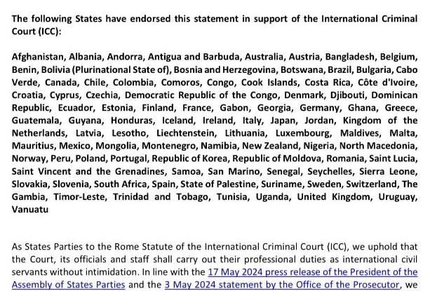 UCM'ye destek verildiği ifade edilen ve UCM üstünde baskı talebi kurulmaması çağrısında bulunulan mektupta şu ifadeler yer aldı: “Mahkeme'nin, yetkililerinin ve personelinin uluslararası kamu görevlileri olarak mesleki görevlerini baskı uygulanmadan yerine getirmelerini destekliyoruz. Bağımsız ve tarafsız bir yargı kurumu olarak Mahkeme'ye olan sarsılmaz desteğimizi teyit ediyoruz. Bu bağlamda, Mahkeme'ye, görevlilerine ve Mahkeme ile iş birliği yapanlara yönelik her türlü siyasi müdahale ve baskıya karşı Mahkeme'nin bütünlüğünü koruyacak ilke ve değerleri muhafaza etme ve savunma taahhüdümüzü yineliyoruz. Cezasızlığa karşı birlik olma kararlılığımızı yineliyoruz. Dünyanın ilk ve tek daimi uluslararası ceza mahkemesi olan UCM, uluslararası barış ve güvenlik mimarisinin temel bir bileşenidir. Bu nedenle tüm devletleri, dünyanın barış, güvenlik ve refahını tehdit eden ağır suçlar olan soykırım, savaş suçları, insanlığa karşı suçlar ve saldırı suçunun tüm mağdurları için eşit adaletin sağlanması yönündeki önemli görevini yerine getirebilmesi için Mahkeme ile tam bir iş birliği sağlamaya çağırıyoruz.”