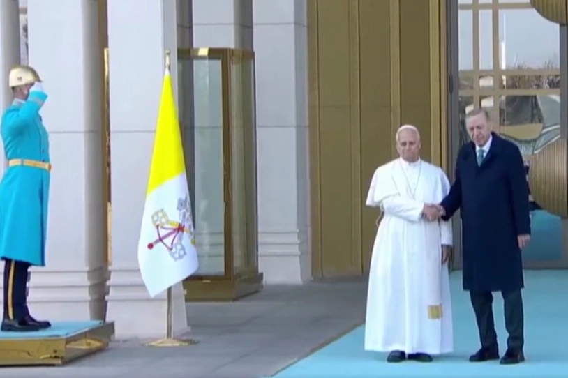 https://twitter.com/RTErdogan/status/1994001449332744629Cumhurbaşkanlığı Külliyesi’nde, Cumhurbaşkanı Erdoğan tarafından resmi törenle karşılanan Papa, Türkiye ile Vatikan bayrakları önünde tokalaşarak, basın mensuplarına poz verdi.