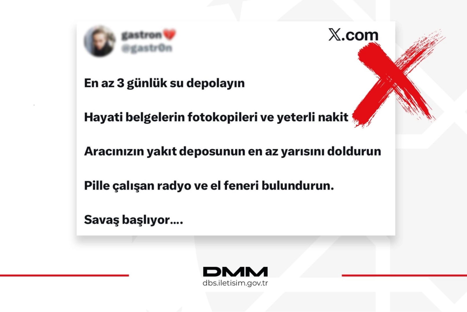 ANKARA (İGFA) - Dezenformasyonla Mücadele Merkezi, bazı sosyal medya hesaplarında dolaşıma sokulan ve Türkiye’de savaş başlayacağı iddiasıyla vatandaşların çeşitli hazırlıklar yapması gerektiğini öne süren paylaşımların dezenformasyon içerdiğini duyurdu.
