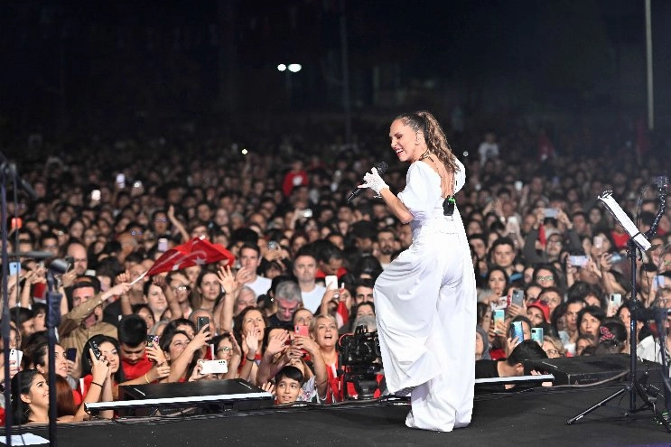 Başkan Uysal’ın konuşmasının ardından kutlamalarda Sertab Erener sahne aldı. Erener, binleri “Doğum gününüz kutlu olsun” diye selamladı ve cumhuriyetin 100’üncü yaşını kutladı. Büyüleyici bir sahne performansına imza atan Sertab Erener’in, şarkı aralarında Atatürk’ün söylevlerinden oluşan video şovu büyük alkış aldı.