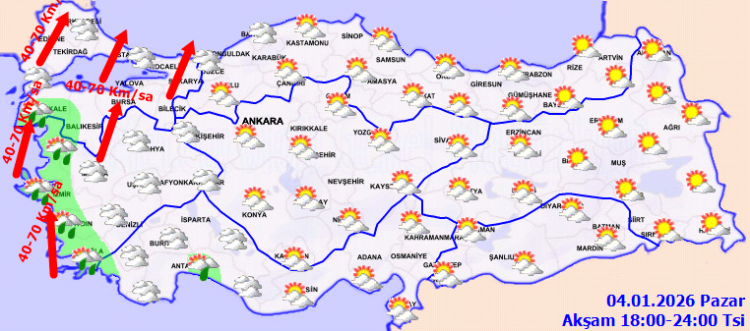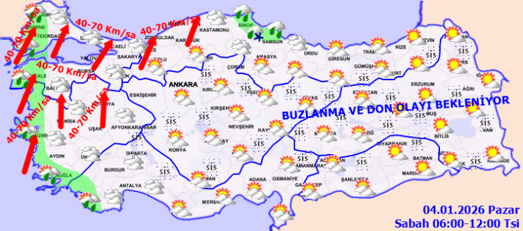 Sabah ve gece saatlerinde iç ve doğu kesimlerde buzlanma, don, pus ve sis etkili olacak. Hava sıcaklıkları kuzey, iç ve batı bölgelerde artarak normallerin üzerine çıkması bekleniyor. Rüzgârın ise Marmara, Ege ve Batı Karadeniz’de güneyli yönlerden kuvvetli ve yer yer fırtına şeklinde (40-70 km/sa) esmesi öngörülüyor.